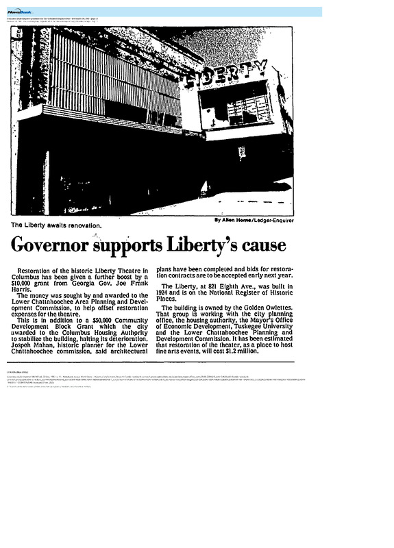 Plans to reopen the Liberty Theatre were made in the 1980s, with funds coming from grants from the city of Columbus and from the govenor of Georgia. Additional funds also came from a benefit concert. With all this community support, the Liberty was re-opened in 1997 ("About Us").