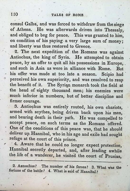 This book gives a great insight into the lives and expectations of the Fontaine Family. Peter Parley’s Tales about Ancient Rome, With Some Account of Modern Italy by Samuel G, Goodrich gives a bit of insight into the schooling of the Fontaine Children. This is due to the similarities this book has to a textbook found in classrooms today. The author organized the chapters of the book into numbered paragraphs, and each number corresponds to a number in the footnotes. The footnotes have questions about their corresponding paragraphs. The numbering and questions are similar to a textbook of today. This book also does not have any writing in the margins like other books in this collection, and you can tell this book was used quite often due to the spine needing rebound. The Fontaine family lived in the establishment and rise of public schools, but the city of Columbus, GA did not have many, if any, public schools until the late 1800s. [1] The Fontaine family had many options to educate their children, from educating them at home to sending them to an academy. Wherever they were educated, this book was likely used as a part of the education of many generations of the family due to the content and organization of the book, as well as the wear on the book.