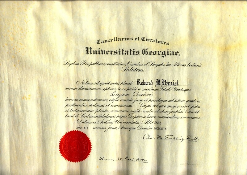 Dr. Daniel was one of eleven members of the 1911 class of Delta Tau Delta fraternity at Emory College in Oxford, Georgia. Dr. Daniel was later awarded the lifetime membership of this fraternity as well as an honorary life membership to the prestigious Phi Beta Kappa fraternity of the University of Georgia.