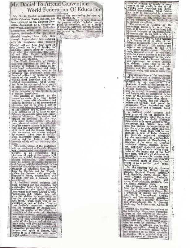 Dr. Daniel, along with his daughter Mildred, attended the World Federation of Education Association in Geneva, Switzerland in 1935. This conference addressed the issues endangering world peace. Held at the World Court of the League of Nations, educators from around the world discussed how education would be the antithesis to propaganda in times of political uproar.