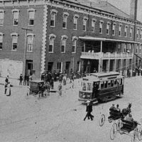 It shows a main street in Columbus, with streetcars, carriages, and pedestrians bustling about in the city. It gives an idea of what the city center looked like at the dawn of the 20th century, with commerce, early public transportation, and everyday life
