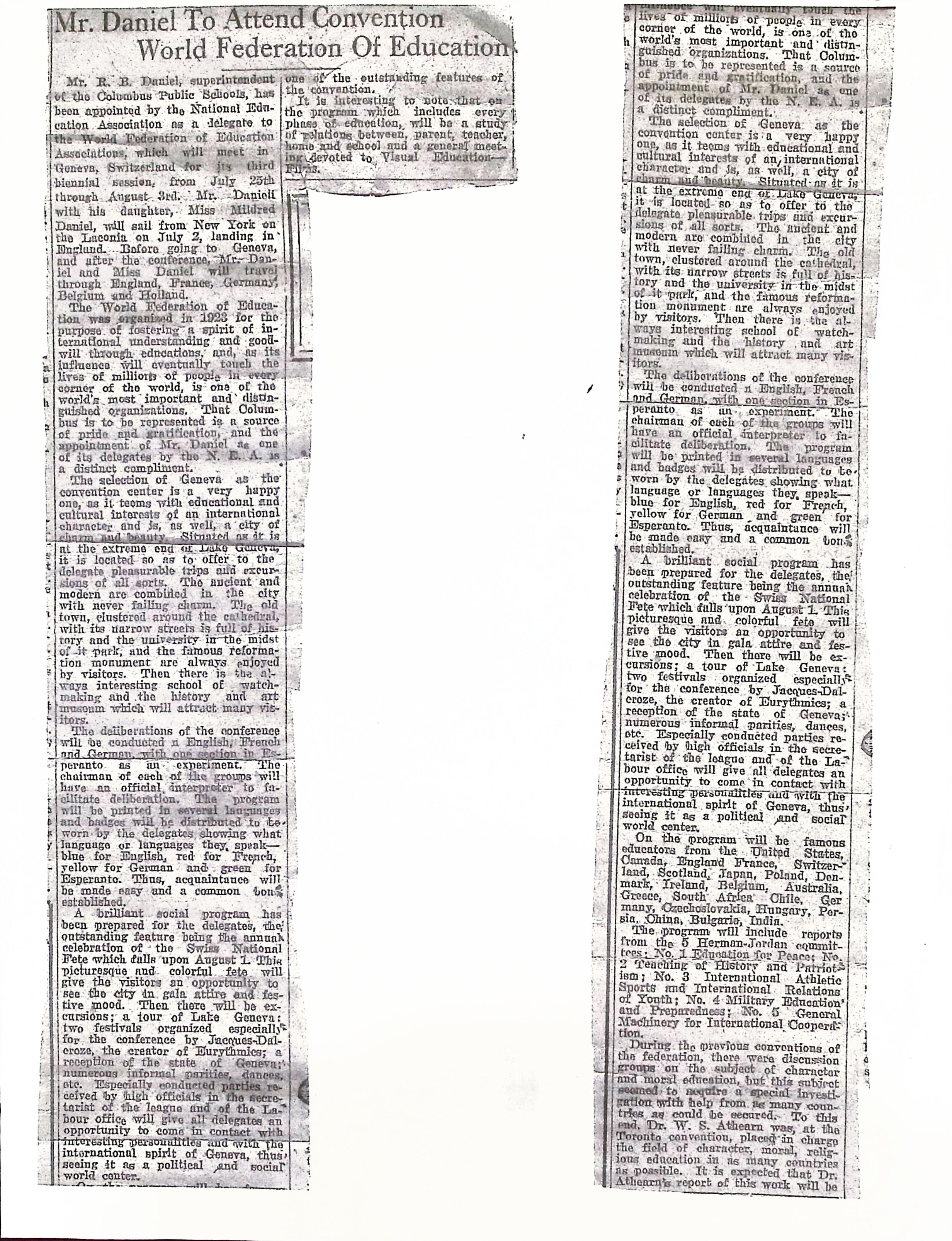 1.) Newspaper clippings citing Dr. Daniels attendance to the Geneva World Education Assocaition in 1929.