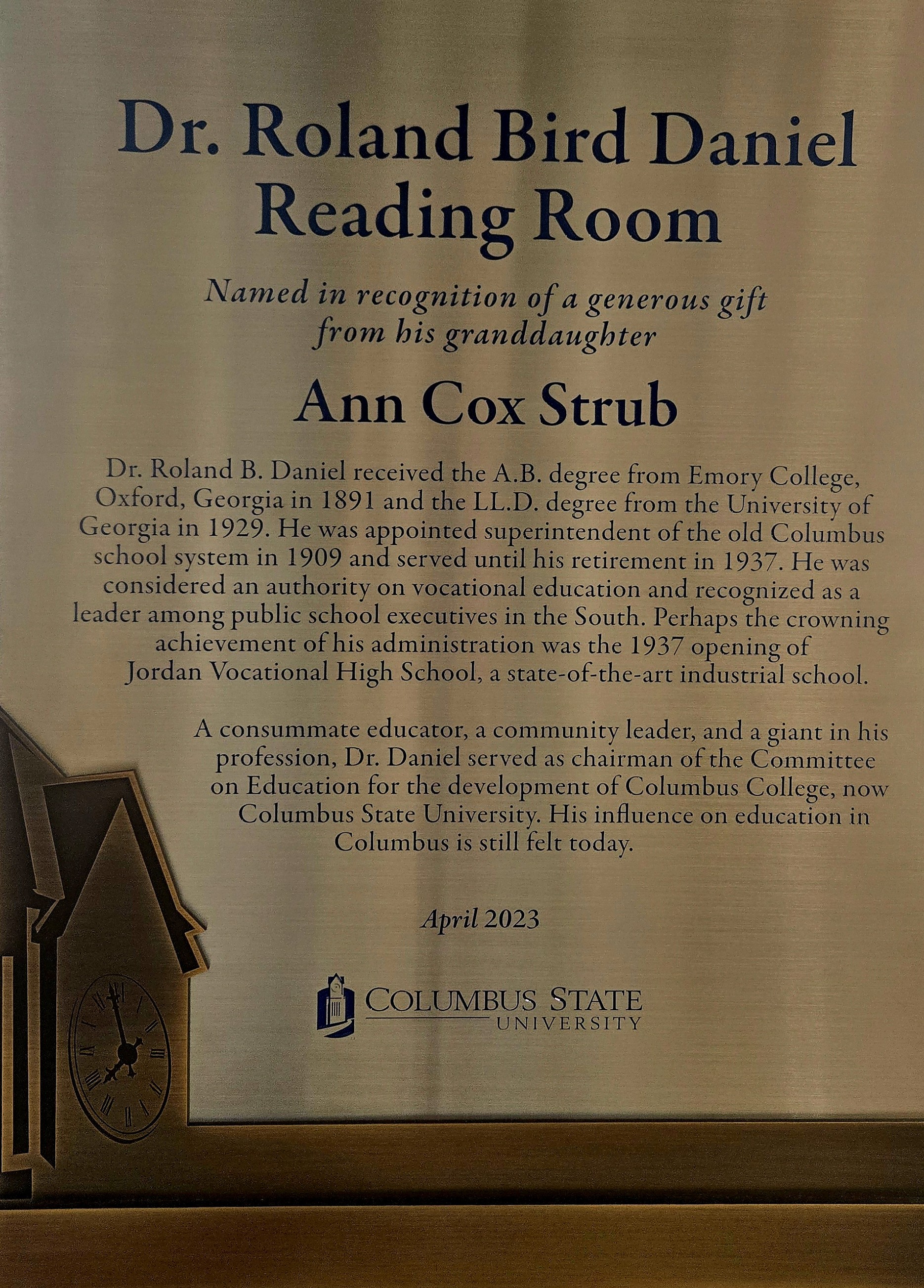 “Dedication Plaque to Roland B. Daniels,” Columbus State University Archives and Special Collections , accessed December 17, 2025, https://digitalarchives.columbusstate.edu/items/show/4584.